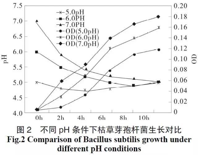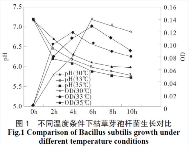 通過圖1、圖2 可以看出,隨著培養(yǎng)基pH 的升高,枯草芽孢桿菌的菌濃度隨之增加;隨著培養(yǎng)溫度的提高,枯草芽孢桿菌的生長速度明顯加快,但OD值隨之降低。根據(jù)菌種活力以及穩(wěn)定性等多方面因素考慮,選擇30 ℃、pH7.0為枯草芽孢桿菌的最適條件。