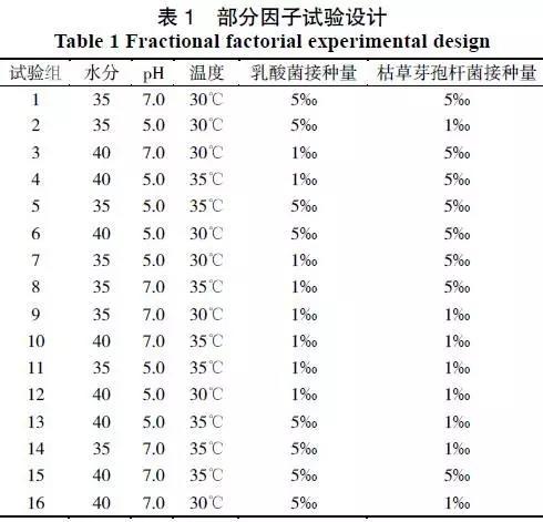 由于試驗因素較多,對全部因子進行交互試驗,費時費力,因此,利用minitab 軟件進行輔助,設計部分因子試驗,以之前試驗出的乳酸菌和枯草芽孢桿菌最適生長條件為界限,擬定試驗因子為pH(最小值5.0、最大值7.0)、溫度(最小值30 ℃、最大值35 ℃)、水分(最小值35%、最大值40%)、乳酸菌接種量(最小值1‰、最大值5‰)、枯草芽孢桿菌接種量(最小值1‰、最大值5‰),具體設計如下:每個試驗組重復進行三次試驗,在發(fā)酵過程第1、3、7、15 d分別對各試驗組取樣進行顏色、氣味、酸度、水分、微生物數(shù)量等檢測、并根據(jù)各試驗組發(fā)酵水平,進行綜合評定,將綜合評定值平均平均數(shù)返回設計軟件,通過回歸方程,經(jīng)層層刪減,計算各因子影響性(表1-2)。